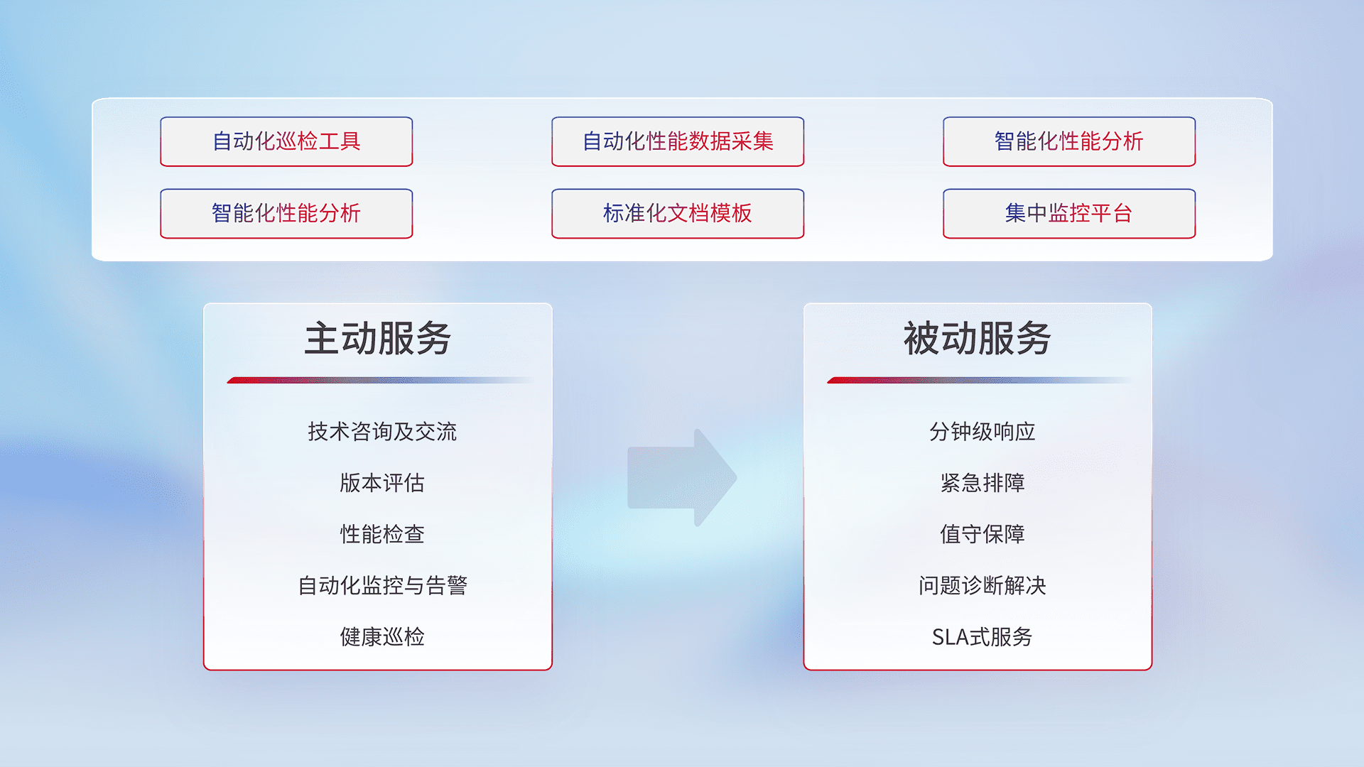 智能化工具和标准化文档,,保障服务质量,,,提供主动服务(包含技术咨询、、版本评估、、、、性能检查、、、、自动化监控与告警、、健康巡检)和被动服务包含(分钟级响应、、紧急排障、、、值守保障、、问题诊断解决、、、SLA服务)。。
