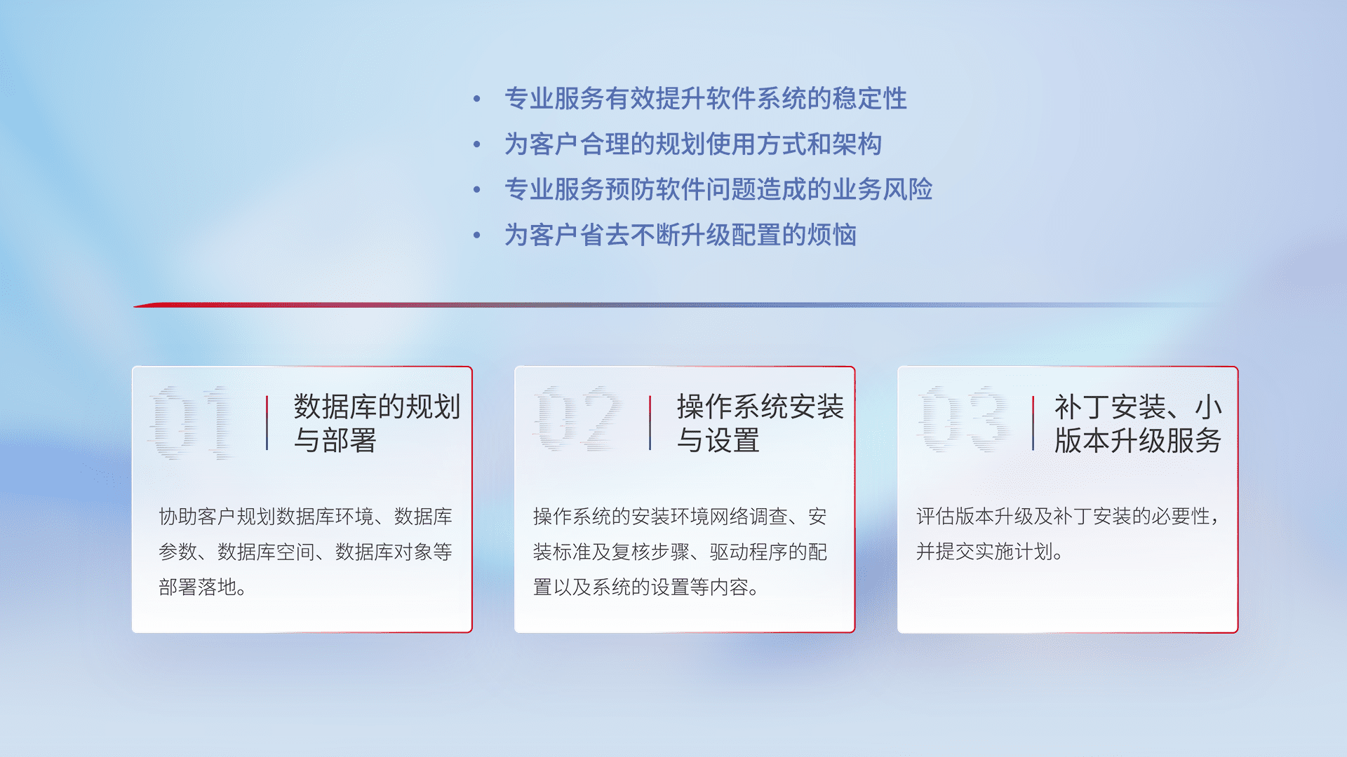 为客户提供软件规模升级、、快速部署、、、按需配置的专业服务,,,从数据库的规划与部署到操作系统的安装与设置,,,,再到补丁安装和小版本升级提供支持。。。